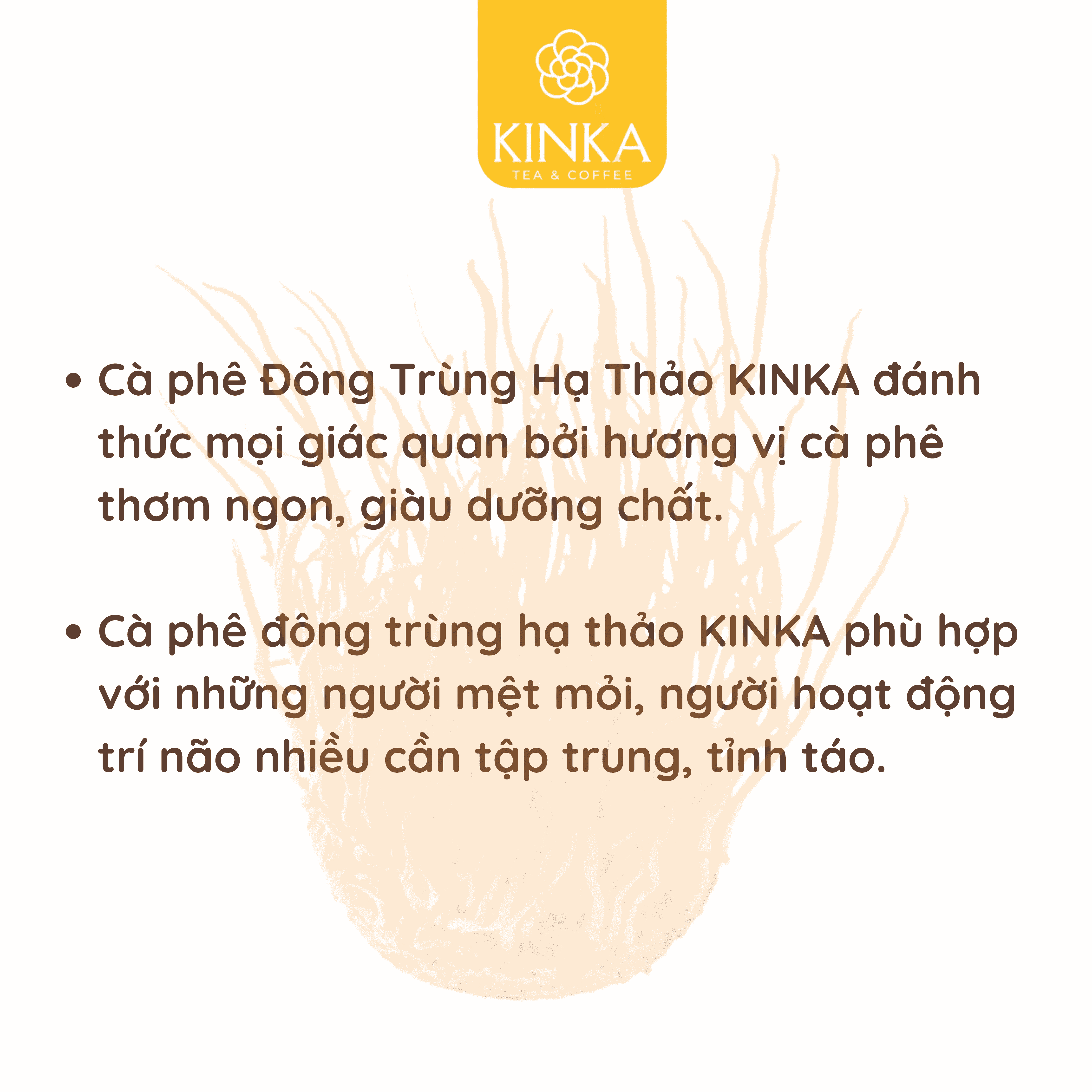 Cùng thưởng thức một ly cà phê đặc biệt, một phần sức sống đầy đặn đến từ Cà Phê Đông Trùng Hạ Thảo KINKA! Không chỉ là một thức uống thú vị, mà nó còn là chìa khóa giúp bạn khám phá sức khỏe và sự trẻ trung từ bên trong. Được chiết xuất từ đông trùng hạ thảo tự nhiên tinh khiết, Cà Phê Đông Trùng Hạ Thảo KINKA không chỉ bồi bổ cơ thể mà còn giúp tăng cường đề kháng, làm giảm căng thẳng mệt mỏi và ốm yếu.