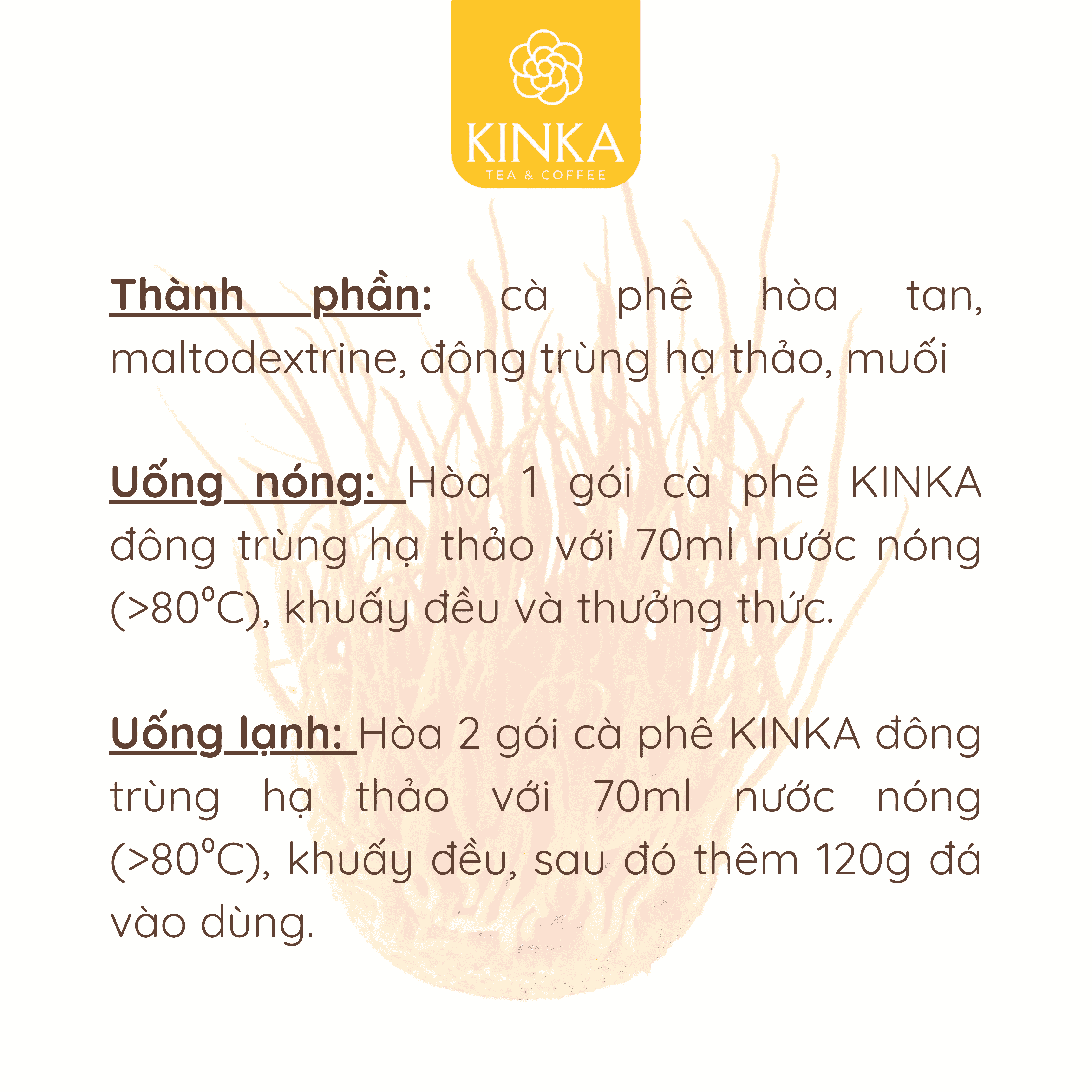 - Uống nóng: Hòa 1 gói cà phê KINKA đông trùng hạ thảo với 70ml nước nóng (>80⁰C), khuấy đều và thưởng thức.